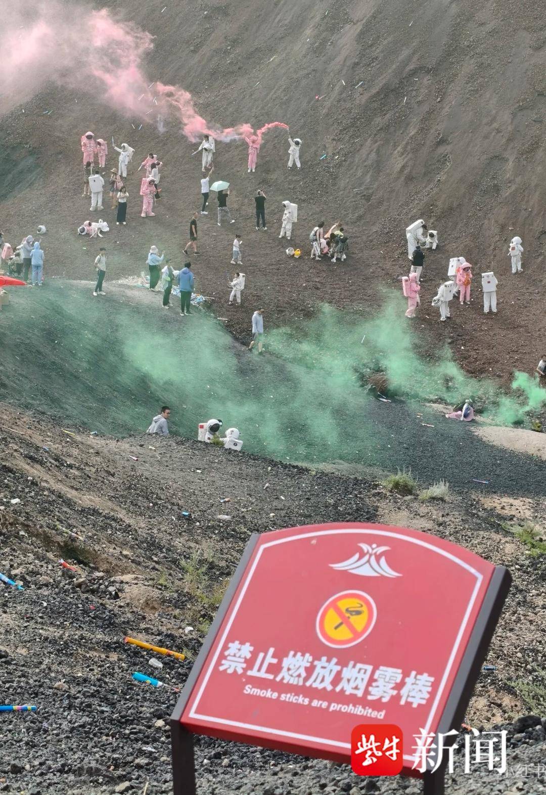 记者在另一个帖子上看到,一些游客身穿“宇航服”,在火山山体斜坡上手持绿色、黄色等颜色的烟雾棒合影。这张图片上能看到有一个非常醒目的警示牌,上面写着,“禁止燃放烟雾棒”!还有一张图片则显示,地面上被丢弃了很多烟雾棒残骸。